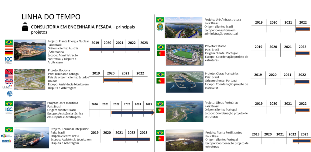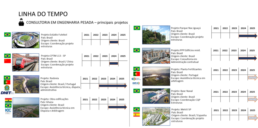 Com base na experiência corporativa prévia ao longo de 25 anos de atuação na construção pesada em diversos países, ocupando cargos operacionais e comerciais em projetos de grande porte e contratos de valor superior a USD 900 milhões, oferecemos serviços na área de consultoria em segmentos diversos: